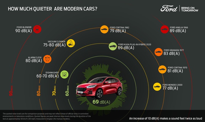 Ein von Ford realisierter inoffizieller Test ergab, dass die Insassen des neuen Kuga Plug-in-Hybrid einem bis zu vierfach geringeren Geräuschpegel ausgesetzt sind als noch ihre Großeltern in einem Ford Anglia aus dem Jahre 1966. Erhöht man den Schalldruck um rund zehn Prozent, wird er von den meisten Menschen als doppelt so laut wahrgenommen.
