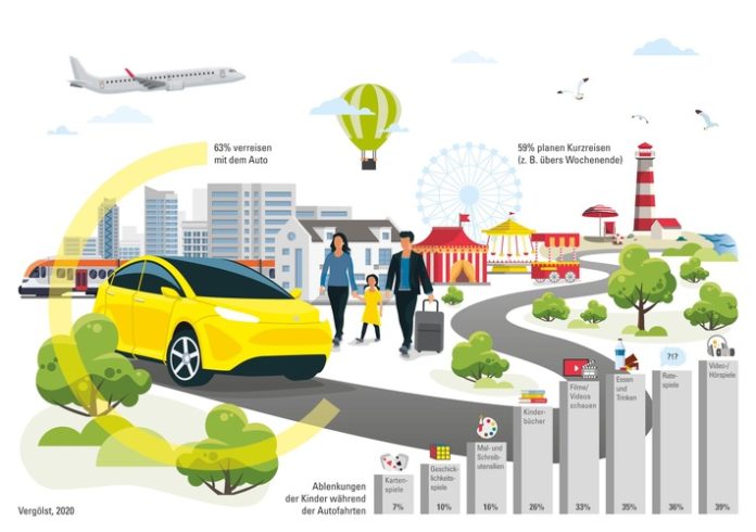 Egal ob ans Meer oder in die Berge: 59 Prozent der befragten Autofahrer planen dieses Jahr Kurzausflüge über das Wochenende, 47 Prozent haben sich sogar längere Aufenthalte vorgenommen. Gerade auf langen Fahrten mit Kindern sind Ablenkungsmöglichkeiten immer ein guter Zeitvertreib. 39 Prozent der befragten Pkw-Eigentümer mit Kindern setzen dabei auf Video oder Hörspiele für die Kleinen. Doch auch Ratespiele, darunter Klassiker wie „Ich sehe was, was du nicht siehst“, sind für 36 Prozent eine gute Wahl. 35 Prozent setzen auf Ablenkung durch Essen und Trinken. Mehrfachnennungen waren in der Befragung möglich. Im Übrigen setzen 81 Prozent der befragten Autofahrer bei ihren Reisen auf eigene Speisen und Getränke. Mehr als ein Drittel entscheidet sich aber auch für einen schnellen Imbiss in Fast-Food-Restaurants