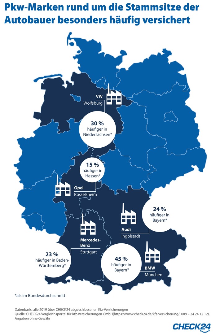 „Die Identifikation mit den Autobauern in der eigenen Region scheint besonders hoch zu sein“ , sagt Dr. Tobias Stuber, Geschäftsführer Kfz-Versicherungen bei CHECK24. „Verbraucher entscheiden sich häufig für die Marken, die in ihrem Bundesland produziert werden.“