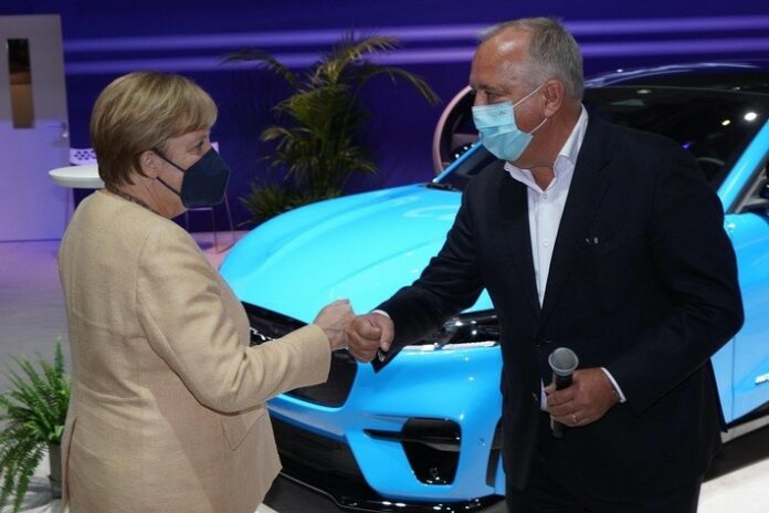 Ford-Werke Chef Gunnar Herrmann zeigt der Kanzlerin den vollelektrischen Ford Mustang Mach-E GT, der seine europäische Messepremiere auf der IAA feiert