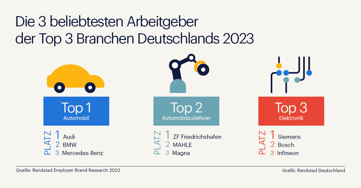 Eschborn, Juni 2023. Besonders die Automobil-, die Automobilzuliefererbranche sowie Elektronik stehen bei deutschen Arbeitnehmerinnen und Arbeitnehmern hoch im Kurs – das zeigt die aktuelle Randstad Employer Brand Research, bei der Anfang des Jahres mehr als 3.800 Beschäftigte zur Arbeitgeberattraktivität befragt wurden. Auf Platz 1 des jeweiligen Siegertreppchens dieser Top-3-Branchen stehen Audi, ZF Friedrichshafen und Siemens. Die Nummer 1 der Elektronikbranche – Siemens – ist zudem von den Befragten zum branchenübergreifenden Gesamtsieger 2023 gekürt worden.